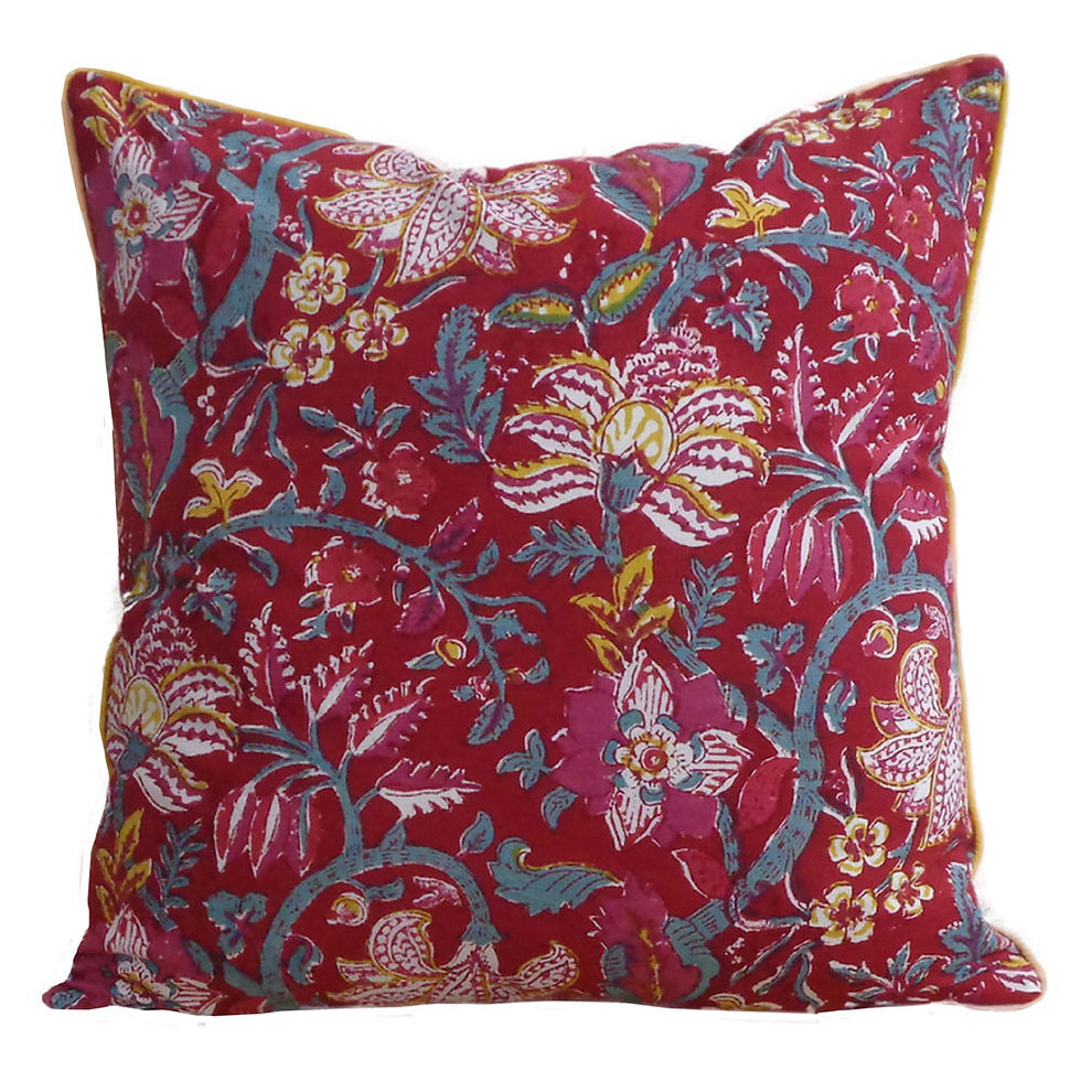 Neem Raspberry Hand Block Print Cotton Cushion Cover with Piping